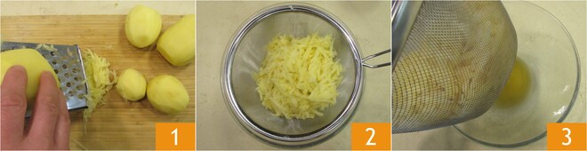 Para preparar os latkes, descasque as batatas e rale-as com um ralador de furos grandes 1. Coloque as batatas raladas em uma peneira sobre uma tigela e deixe descansar por 10-15 minutos 2: dessa forma, elas perderão a água de vegetação e não escurecerão 3.
