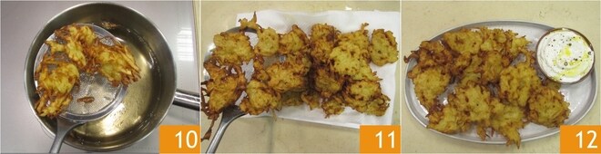 Frite por 3-4 minutos no total, virando as panquecas de ambos os lados 10. Quando estiverem bem douradas, escorra em papel absorvente 11. Seus latkes estão prontos para serem servidos ainda quentes, acompanhados de creme azedo com endro 12!