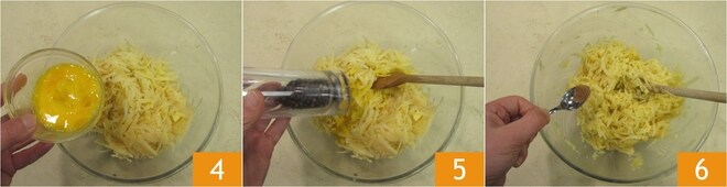 Transfira as batatas para uma tigela e adicione o ovo 4, o sal, a pimenta 5 e a noz-moscada 6.