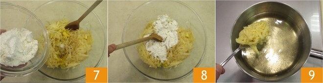Por último, adicione a farinha 7 e misture tudo com uma colher 8. Despeje dois dedos de azeite em uma panela e aqueça até 170°, depois adicione algumas colheradas da massa de cada vez 9.