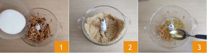 Para preparar os lebkuchen, coloque no processador as nozes sem casca e metade do açúcar (80 g) 1. Triture intermitentemente, de modo a obter nozes em pó, mas também uma parte mais grosseira 2. Despeje em uma tigela e reserve. Coloque no processador a laranja cristalizada, o cedro cristalizado e o mel 3.