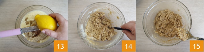 Adicione também a casca ralada de ¼ de limão 13 e misture a massa 14. Pegue 30 g de massa 15.
