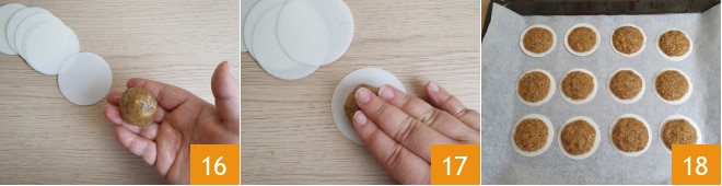 Com as mãos ligeiramente úmidas, faça uma bolinha 16 e coloque-a no centro de uma hóstia de confeitaria de 7 cm. Achate-a ligeiramente 17 e modele-a de modo a deixar uma borda livre de cerca de 5 mm. Continue assim até terminar a massa. Coloque os biscoitos em uma assadeira forrada com papel manteiga 18.