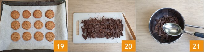 Asse no forno estático pré-aquecido a 200°C por 13 minutos, até que as bordas estejam douradas. Depois, retire do forno 19 e aguarde que os Lebkuchen esfriem ligeiramente e ganhem consistência, antes de retirá-los da assadeira. Enquanto isso, continue com a segunda fornada. Uma vez prontos, você poderá escolher se os servirá ao natural ou cobertos com chocolate ou Punch. Nós mostramos como fazê-los mistos. Para a versão com chocolate: pique o chocolate com uma faca 20, transfira para uma panelinha, adicione 1 colher de sopa de óleo 21