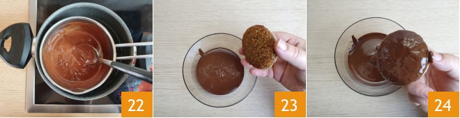 e derreta em banho-maria 22. Depois, transfira para uma tigelinha. Pegue um biscoito e mergulhe a base no chocolate 23, sacuda ligeiramente para deixar escorrer o excesso de cobertura 24