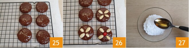e coloque-o sobre uma grade com a parte do chocolate voltada para cima 25. Enquanto o chocolate ainda está macio, você pode decorar os biscoitos com meia cereja cristalizada e/ou algumas amêndoas 26. Para a versão com cobertura de Punch: coloque em uma tigela o açúcar de confeiteiro e adicione 1 colher de sopa de rum 27