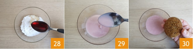 e 1 colher de sopa de vinho tinto 28. Misture brevemente até obter uma cobertura homogênea 29. Pegue um Lebkuchen e mergulhe a base na cobertura 30,