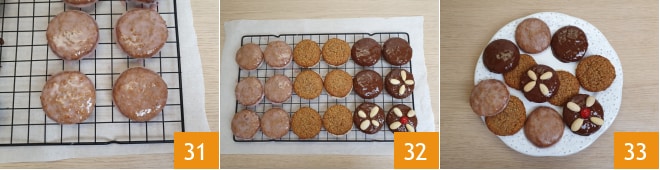 depois sacuda ligeiramente para eliminar o excesso de cobertura e coloque-o sobre uma grade com a parte da cobertura voltada para cima 31. Deixe os biscoitos secarem 32, e sirva-os 33.