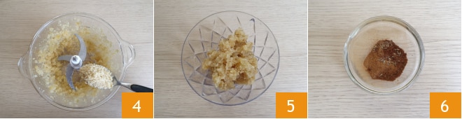 Triture, então adicione também 1 colher de sopa de nozes trituradas 4, para facilitar a operação. Reserve 5. Prepare também a mistura de especiarias: coloque em uma tigelinha a canela, os cravos-da-índia em pó, o coentro, o cardamomo, a noz-moscada e o anis estrelado. Misture brevemente 6. Esta é uma mistura que pode ser comprada pronta na Alemanha, conhecida justamente como "mix para lebkuchen".