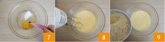 Quebre dois ovos inteiros e transfira-os para uma tigela, adicione o açúcar restante e as sementes de meia fava de baunilha 7. Bata com a batedeira até obter uma mistura espumosa 8. Adicione as nozes trituradas 9,