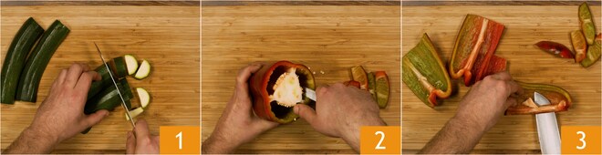 Para preparar os legumes assados fáceis, primeiro lave todos eles. Depois corte as pontas das abobrinhas, corte-as ao meio no sentido do comprimento e depois em fatias de cerca de 1,5 cm de espessura. Passe para os pimentões, retire a tampa superior e tire a parte com as sementes 2. Corte-os em 4 partes e retire também os filamentos brancos 3.