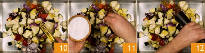 Tempere com óleo 10, sal 11 e pimenta 12.