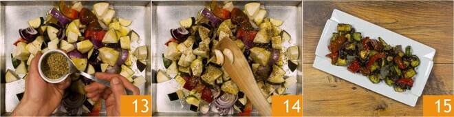 Adicione uma pitada de orégano 13 e dois dentes de alho com casca 14. Misture muito bem, para temperar todos os legumes. Asse em forno estático pré-aquecido a 190°C por cerca de 40-45 minutos ou até que os legumes estejam bem cozidos e dourados. Retire do forno e sirva 15.