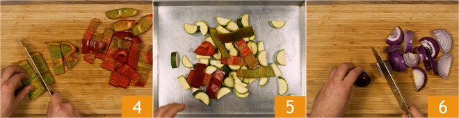 Faça tiras longas 4. Enquanto isso, transfira para uma assadeira grande o suficiente tanto as abobrinhas quanto os pimentões 5. Passe agora para as cebolas, descasque-as e corte em fatias de 1 cm de espessura 6.
