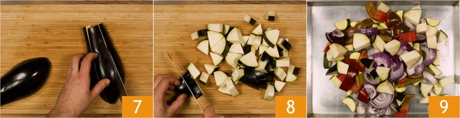 Passe agora para as berinjelas. Corte-as primeiro em fatias 7 e depois em pedaços 8. Transfira para a assadeira com os outros legumes as cebolas e as berinjelas também 9.