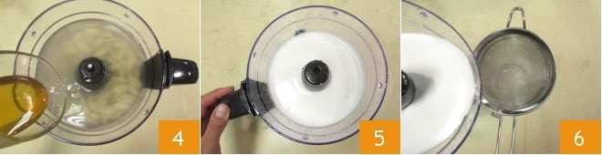 Para preparar o leite de amêndoa, primeiro coloque as amêndoas de molho em uma tigela com 500 g de água por pelo menos uma hora 1. Após esse tempo, despeje tanto as amêndoas quanto a água em um liquidificador com lâminas de aço 2, depois adicione os 500 g de água restantes 3