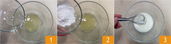 Para preparar os cupcakes de merengue de limão, comece pela preparação do lemon curd: em uma tigela, despeje o suco de limão filtrado, a água 1 e o amido de milho 2, depois misture o composto com um batedor 3.
