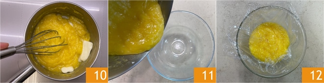 Misture para derretê-lo completamente 10, depois transfira o creme para uma tigela 11 e cubra com filme plástico em contato 12. Coloque na geladeira para esfriar por 2 horas.