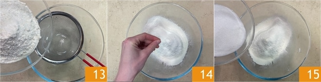 Enquanto isso, dedique-se aos cupcakes: peneire a farinha em uma tigela 13, depois adicione o sal 14 e o açúcar 15.