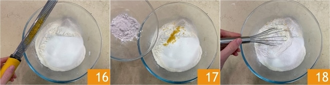 Adicione também as raspas de limão 16 e o fermento 17, depois misture os ingredientes secos com o batedor 18.