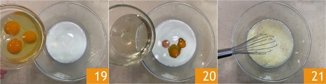 Em outra tigela, despeje o leite, os ovos 19 e o óleo vegetal 20, depois misture os líquidos com o batedor 21.