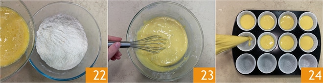 Nesse ponto, adicione os líquidos aos ingredientes secos 22 e misture bem tudo 23. Forre uma forma de muffin com forminhas de papel e preencha cada uma com cerca de 60 g de massa; para ajudá-lo, você pode usar um saco de confeiteiro 24. Asse em forno pré-aquecido a 180°C por cerca de 20-22 minutos.