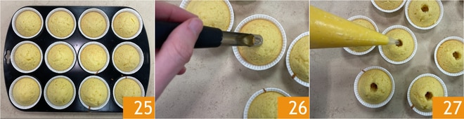 Uma vez assados, retire do forno e deixe esfriar 25. Depois de esfriados, faça um buraco nos cupcakes com um extrator de miolo 26. Pegue o lemon curd e transfira-o para um saco de confeiteiro, depois recheie os cupcakes preenchendo a cavidade com o creme 27.