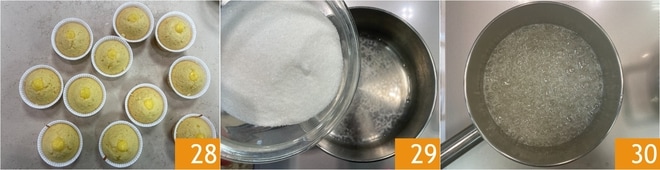 Depois de rechear todos os cupcakes 28, cuide do merengue italiano: em uma panela, despeje a água e 230 g de açúcar 29, depois leve a ferver monitorando a temperatura da calda com um termômetro 30.