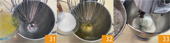 Enquanto isso, despeje as claras 31 e os restantes 50 g de açúcar 32 na tigela de uma batedeira com batedor e comece a bater. Quando a calda atingir a temperatura de 121°C, despeje-a em fio sobre as claras sem parar de batê-las 33. Continue batendo primeiro em baixa velocidade e depois em velocidade mais alta, até o composto esfriar completamente.