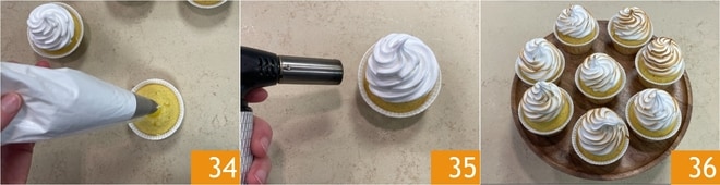 Transfira o merengue para um saco de confeiteiro com bico estrela e decore a superfície dos cupcakes com um belo montinho 34. Finalmente, chame a merengue com um maçarico de cozinha 35. Deixe esfriar seus cupcakes de merengue de limão na geladeira por pelo menos uma hora antes de apreciá-los 36!