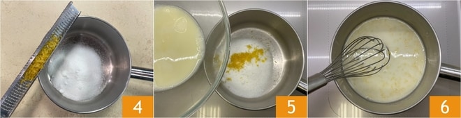 Em uma panela, coloque o açúcar e as raspas de limão 4, depois adicione o composto preparado anteriormente 5. Aqueça em fogo baixo até que o açúcar se dissolva 6.