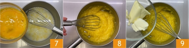Bata os ovos em uma tigela separada, depois despeje-os na panela 7 e cozinhe por mais 2 minutos, mexendo continuamente 8. Quando o composto estiver engrossado, adicione a manteiga 9.