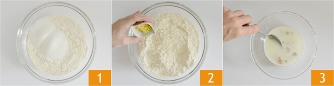 Para preparar os rolinhos de limão, primeiro derreta a manteiga e deixe esfriar. Peneire a farinha em uma tigela, depois adicione o açúcar 1 e a casca ralada do limão 2. Em uma tigelinha à parte, dissolva o fermento em um pouco de leite retirado da quantidade total 3.
