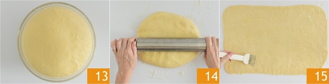Após o tempo de crescimento 13, abra a massa na bancada levemente enfarinhada 14 até formar um retângulo de aproximadamente 48x35 cm e pincele com a manteiga derretida 15.