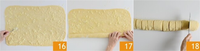 Distribua a mistura de açúcar e limão uniformemente por toda a superfície 16, depois enrole cuidadosamente o retângulo no lado mais longo 17. Divida o rolo obtido em 12 partes de aproximadamente 4 cm cada 18.