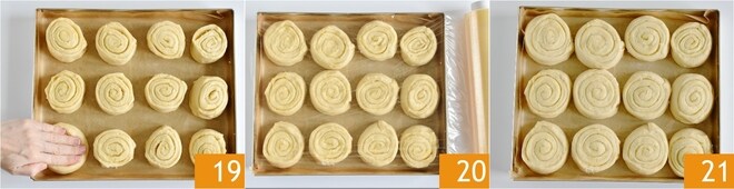 Forre com papel manteiga uma assadeira de 30x20 cm e disponha os rolinhos dentro, afastando-os cerca de 2 cm um do outro, e pressione levemente com a palma da mão 19. Cubra a assadeira com filme plástico e deixe crescer em temperatura ambiente por cerca de 30 minutos 20. Após esse tempo, asse os rolinhos de limão em forno estático pré-aquecido a 180°C por cerca de 30 minutos 21, posicionando a assadeira na prateleira do meio.
