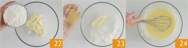Enquanto isso, prepare a cobertura misturando em uma tigela o queijo cremoso com o açúcar de confeiteiro 22, a casca e o suco de limão 23. Misture até obter um composto homogêneo 24, depois deixe descansar na geladeira por 30 minutos.