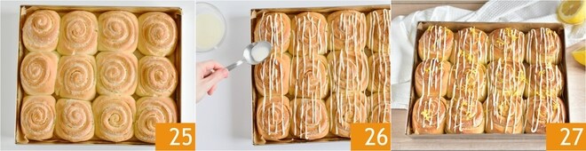 Quando os rolinhos de limão estiverem bem dourados na superfície, retire do forno e deixe esfriar completamente 25, depois você pode decorar com a cobertura 26. Polvilhe a superfície com mais casca ralada a gosto e seus rolinhos de limão estão prontos para serem saboreados 27!
