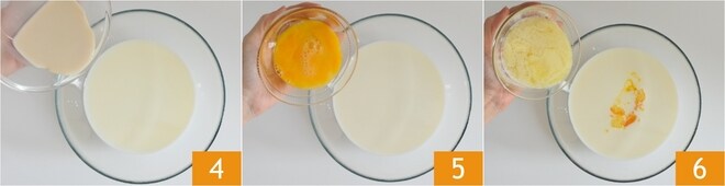 Despeje a mistura de leite e fermento no restante do leite 4, depois adicione o ovo batido 5 e a manteiga derretida morna 6.