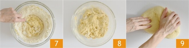 Adicione os líquidos às substâncias secas e comece a misturar com uma colher 7. Quando os ingredientes estiverem bem incorporados 8, transfira a mistura para a bancada e sove por cerca de 10 minutos 9.