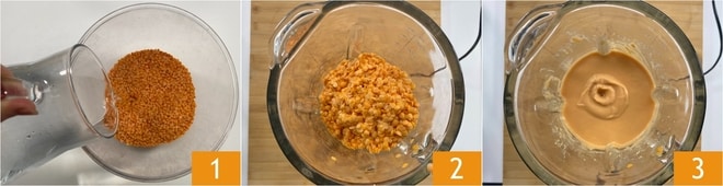 Para preparar o tofu de lentilhas de lentilha vermelha, primeiro cubra as lentilhas com água quente e deixe-as de molho por cerca de 30 minutos 1. Após esse tempo, transfira as lentilhas com sua água para um liquidificador 2, adicione sal e bata na potência máxima; se necessário, adicione um pouco de água fria e use uma espátula para empurrar a mistura em direção às lâminas. Você deve obter uma consistência lisa e homogênea 3.