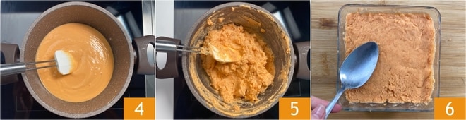 Despeje o purê em uma panela antiaderente e cozinhe, mexendo continuamente 4 até que fique espesso e pegajoso 5; isso levará cerca de 10 minutos. Transfira a mistura para um recipiente de vidro, nivele bem a superfície 6 e cubra com uma folha de papel manteiga em contato. Deixe endurecer na geladeira por cerca de 5 horas.
