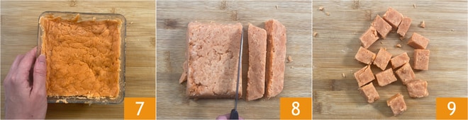 Depois de endurecido 7, vire o bloco e remova o papel manteiga, depois corte em cubos do tamanho desejado 8: seu tofu de lentilhas de lentilha vermelha está pronto para ser utilizado 9!