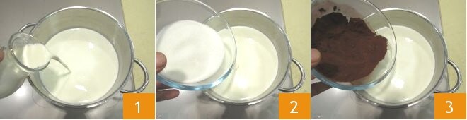 Para preparar o licor de chocolate, comece juntando o leite e o creme de leite em uma panela grande 1. Adicione o açúcar 2 e comece a aquecer a mistura. Adicione também o cacau 3