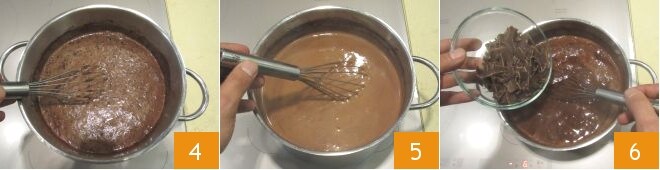 Começando imediatamente a misturar com um batedor para evitar a formação de grumos 4. Continue mexendo com o batedor e leve suavemente à fervura 5. Deixe ferver por cerca de 10 minutos, continuando a mexer; então adicione o chocolate picado grosseiramente 6