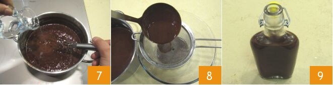 Mexa cuidadosamente até que ele derreta, desligue o fogo e deixe esfriar um pouco. Adicione finalmente o álcool 7 e misture-o bem também. Coe a mistura através de uma peneira fina 8, para evitar possíveis grumos residuais. Uma vez completamente resfriado, distribua o licor de chocolate em garrafas limpas e completamente secas 9. Feche hermeticamente as garrafas, guarde-as na geladeira e deixe o licor amadurecer por 20-30 dias antes do consumo, para que o sabor do álcool fique mais suave e menos invasivo. Agite o licor antes de consumi-lo.