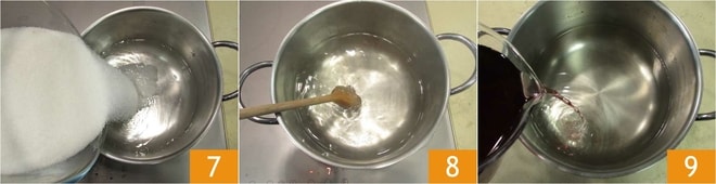 Adicione o açúcar 7 e aqueça a calda sem deixar ferver, para que o açúcar se dissolva 8. Deixe a calda esfriar. Uma vez fria, despeje o álcool macerado 9.
