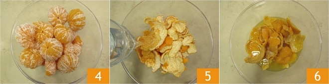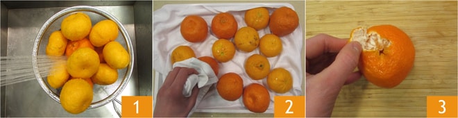 Para preparar o licor de tangerina, primeiro lave as tangerinas em água corrente 1 e seque-as cuidadosamente com um pano limpo 2, depois remova a casca delicadamente 3.