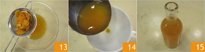 Neste ponto, coe a mistura para eliminar as cascas 13 e transfira para garrafas 14. Seu licor de tangerina está pronto para ser apreciado bem gelado 15!