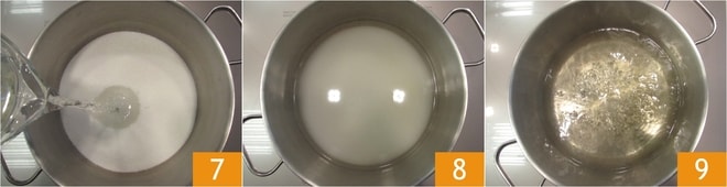 Decorrido este tempo, prepare a calda: coloque o açúcar e a água em uma panela 7, acenda o fogo 8 e espere até ferver 9, depois desligue e deixe esfriar completamente.